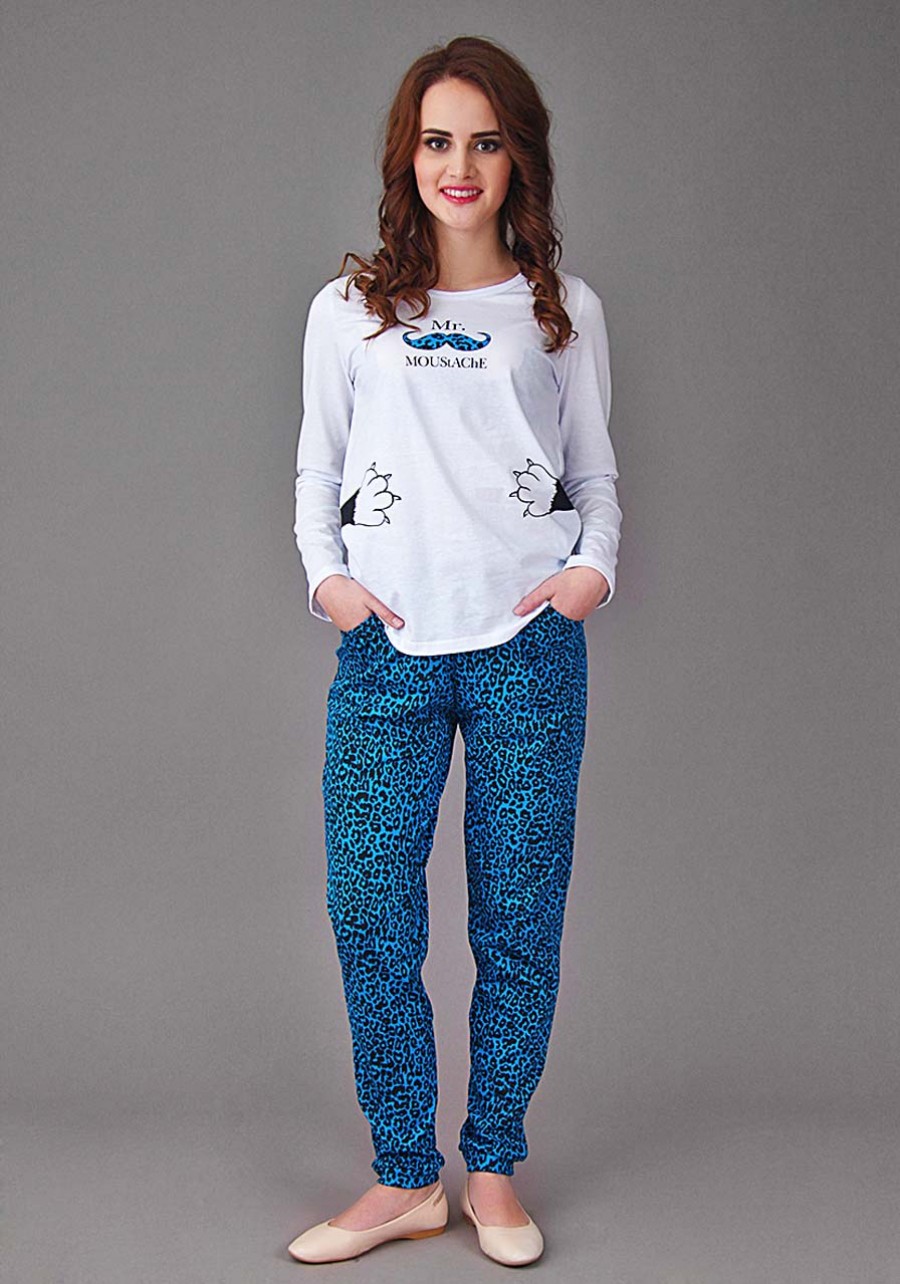Легкий и удобный костюм, с классным принтом <<Кот в труса>> отлично подойдет для домашних дел и отдыха. Костюм состоит из легкой кофты с длинными подшитыми рукавами и низом изделия, окантованной горловиной и отлично сочетается с брюками на манжетиках, обладающими двумя боковыми карманами, поясом на резинке и шнурком.