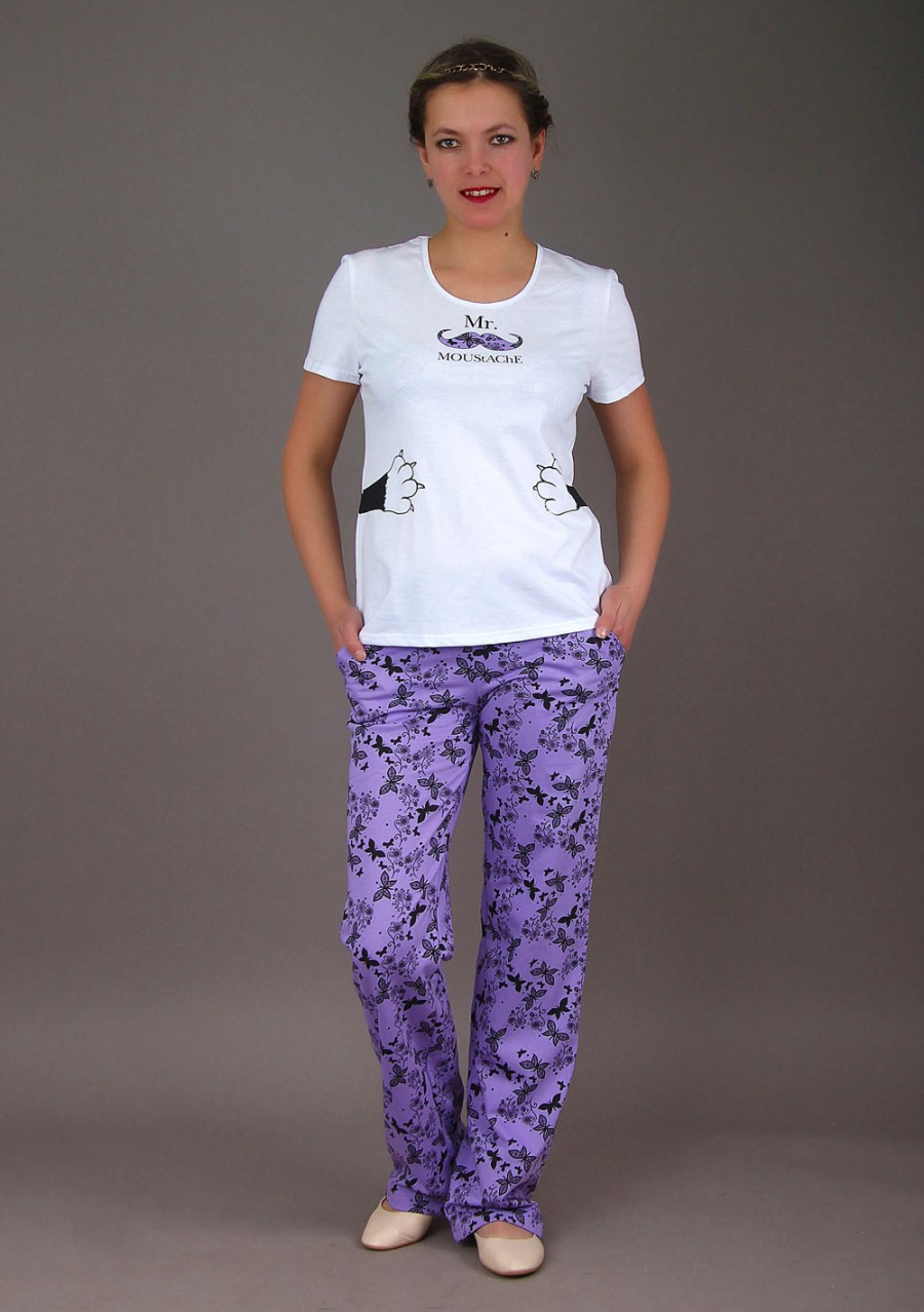 Ткань: кулирка. Состав: 100% хлопок.Прикольный домашний костюм с яркими брюками и удобной футболкой. Брюки обладают удобными карманами, футболка комфортной горловиной и длиной. Расцветка "Бабочки" очень женственна и ненавящива, цвета ткани яркие и красивые.