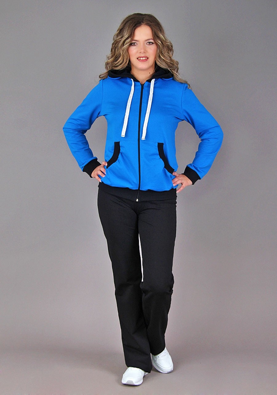 Ткань: футер. Прекрасный брючный костюм! Очаровательные облегающие брюки сидят строго по фигуре и подчеркивают самые соблазнительные формы! Кофта на молнии удобна и функциональна благодаря капюшону, резинке и карманам.