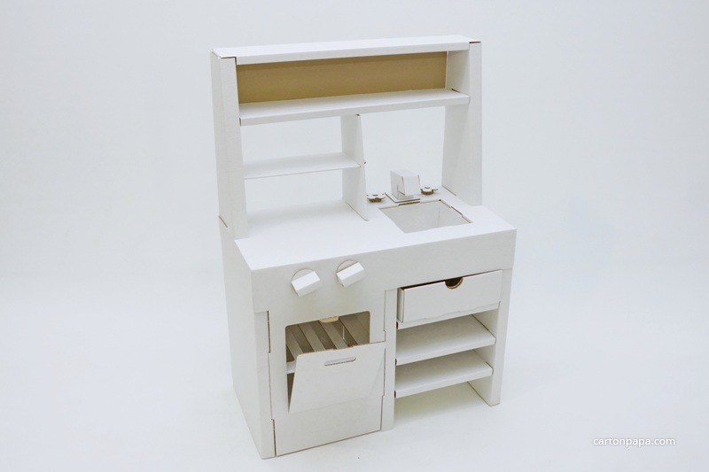 Встречайте большую и удобную картонную кухню с духовкой, плитой на две конфорки, мойкой и ящичком для столовых приборов!