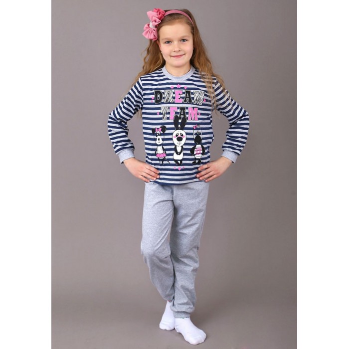 Брючный костюм для занятий спортом и домашними делами, а также для повседневной носки. Кофточка с очаровательным принтом <<Команда мечты>> - мишкой, зайкой и утёнком - прекрасно подойдет как девочке, так и мальчику. Что говорить о брючках - превосходная модель с поясом на резинке и манжетами. Выполнены из кулирки с лайкрой для большей практичности - брюки не деформируются, хорошо тянутся, но возвращаются к исходной форме. Рукава кофты на манжетах, горловина обработана бейкой в цвет полосы. Костюм смотрится очень гармонично и универсально.